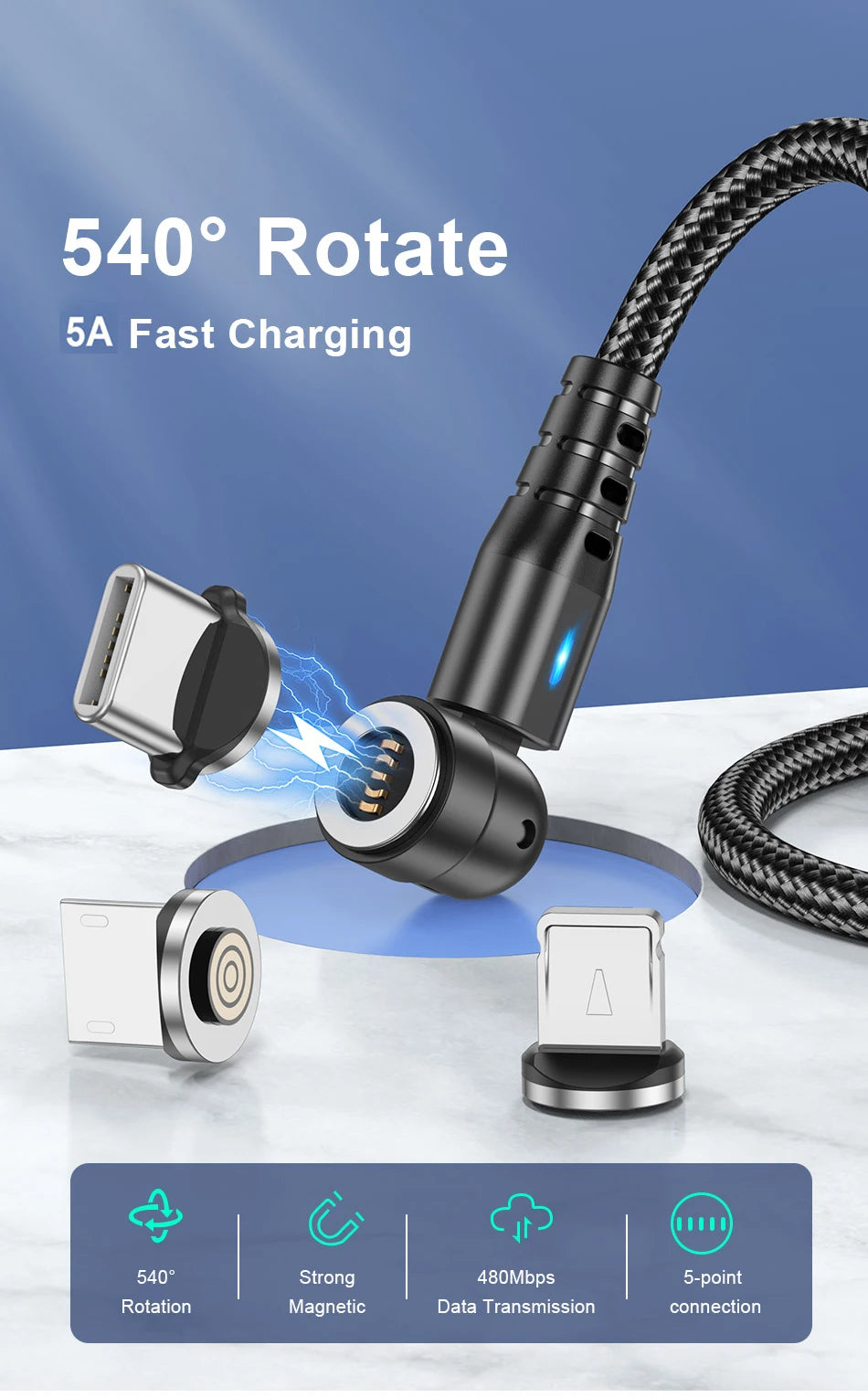 Cable magnético giratorio 5A 480 Mbps Datos